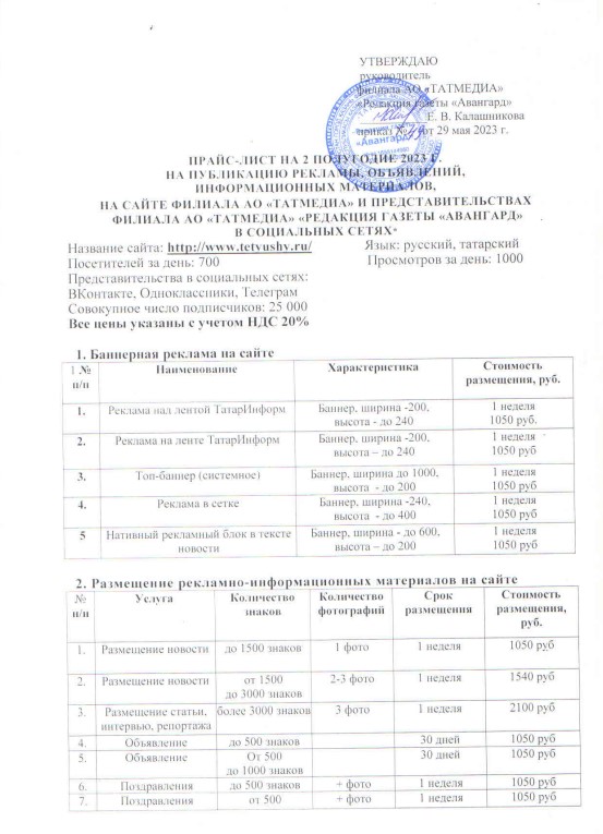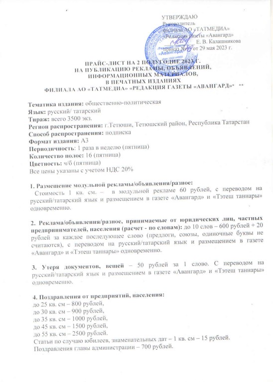 | Информационные сообщения от Совета и Исполкома Тетюшского района | 1 кв. см. с размещением в газете «Авангард» и «Тэтеш таннары» одновременно с переводом на татарский или русский язык. | 80 рублей |