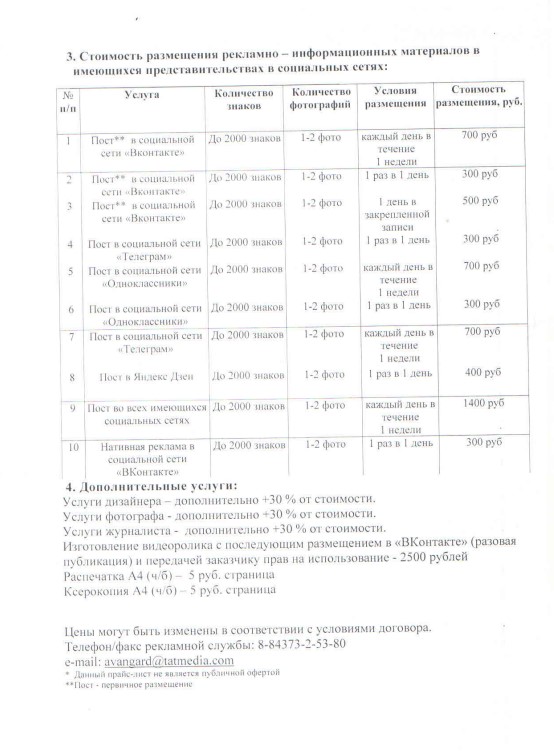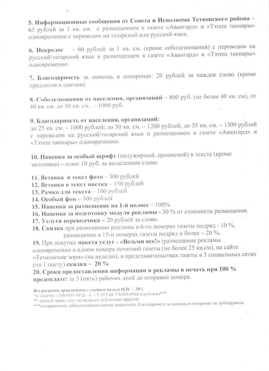 | Некролог | 1 кв. см. (кроме соболезнования) с переводом на русский/татарский язык и размещением в газете «Авангард» и «Тэтеш таннары» одновременно. | 80 рублей |