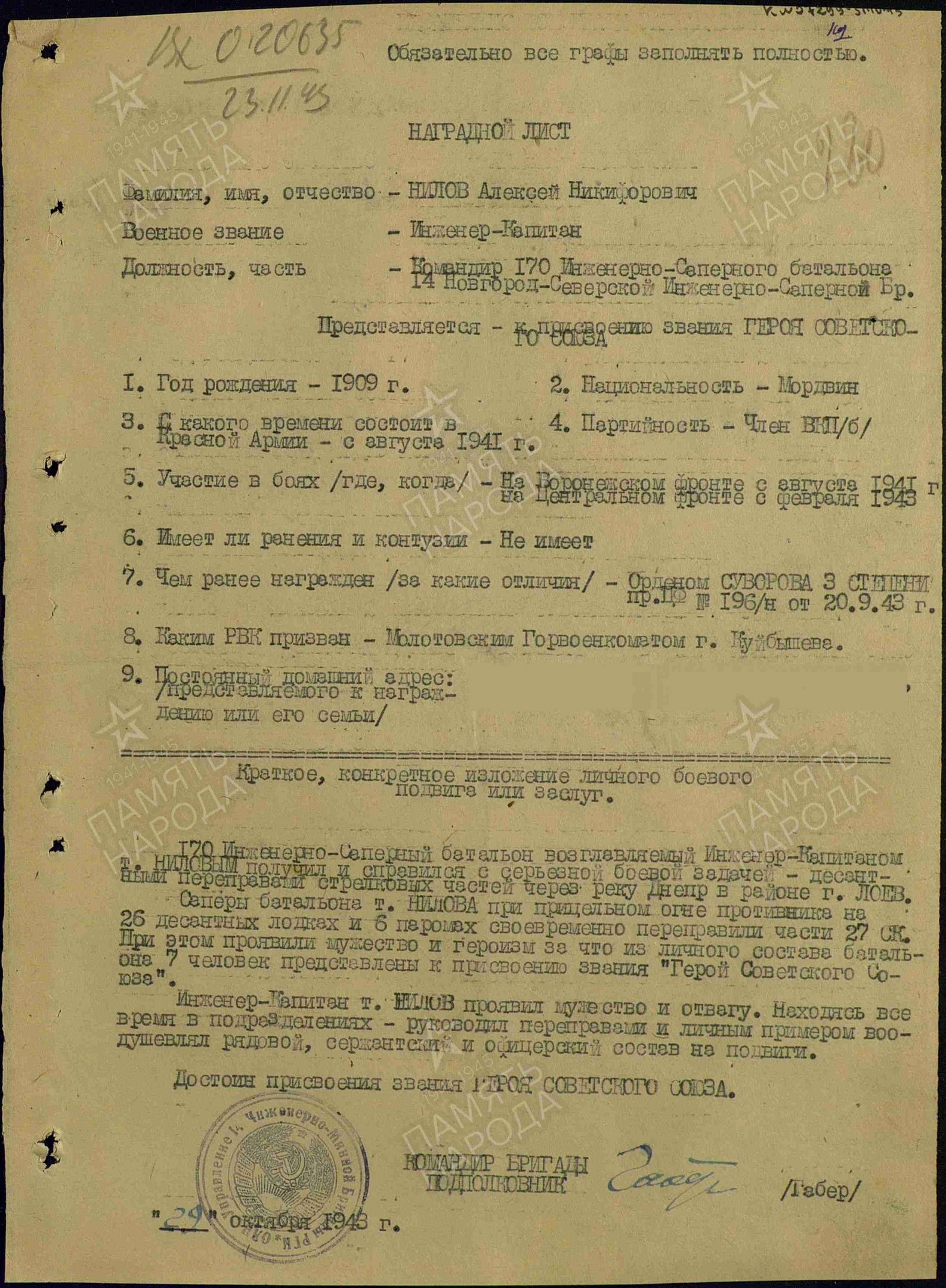 Алексей Нилов к званию Героя Советского Союза представлен 29 октября 1943 года