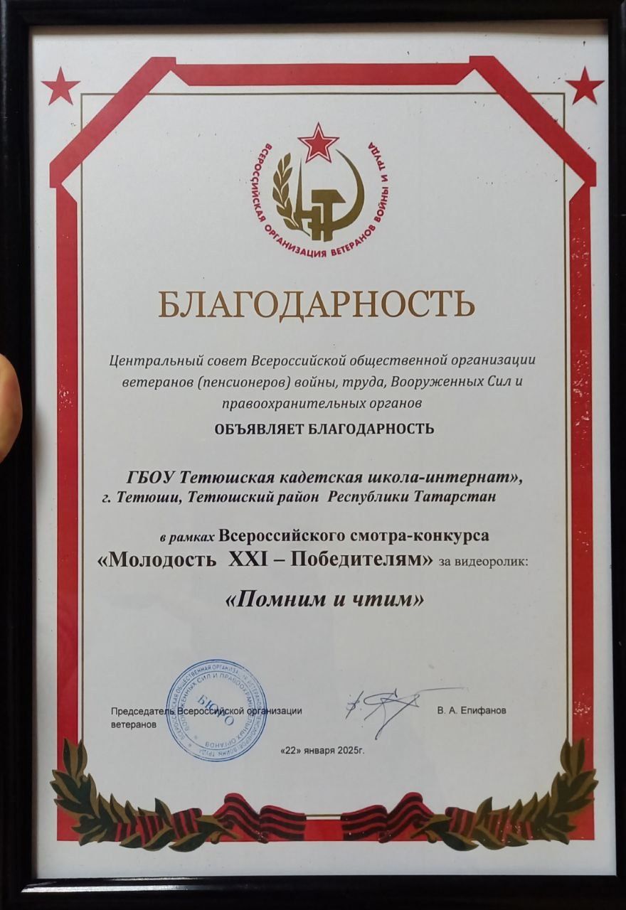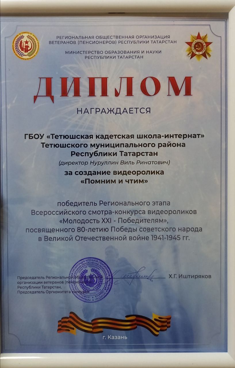 0 февраля 2025 года в Конституционном совете РТ на заседании Президиума Совета Региональной Общественной организации ветеранов (пенсионеров) Республики Татарстан состоялось награждение победителей регионального этапа Всероссийского смотра-конкурса видеороликов «Молодость ХХI – Победителям», посвященного 80-летию Победы советского народа в Великой Отечественной войне 1941-1945 годов.