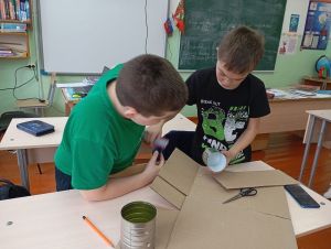Ученики и учителя сельской школы делают окопные свечи для бойцов.