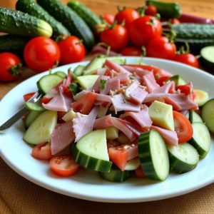 Этот яркий и аппетитный салат сочетает нежную куриную грудку, пикантную ветчину, маринованные огурчики и свежие овощи. Заправленный сметаной, он получается сочным и гармоничным. Готовится быстро, а подавать его можно как в смешанном виде, так и эффектными слоями — идеально для праздника и повседневного стола!