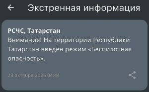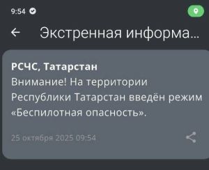 В Татарстане ночью на 29 октября в течение трёх часов действовал режим беспилотной опасности — оповещение поступило через официальное приложение МЧС России.