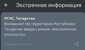 В Татарстане ранним утром ввели режим беспилотной опасности: экстренное оповещение поступило в 04:44 через официальное приложение МЧС России. Режим продолжает действовать — жителям рекомендуют оставаться в безопасных местах и следить за официальными сообщениями.