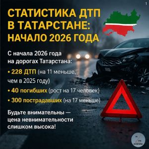 С начала 2026 года на дорогах Татарстана случилось 228 ДТП ( на 11 меньше, чем в 2025 году), где погибло 40 и пострадало 300 человек.